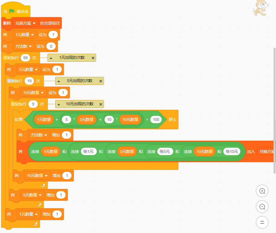 Scratch少儿编程题将100元钱兑换成1元,5元和10元的零钱,请用枚举法编程计算共有几种兑换方法,每种方法各兑换多少张纸币?