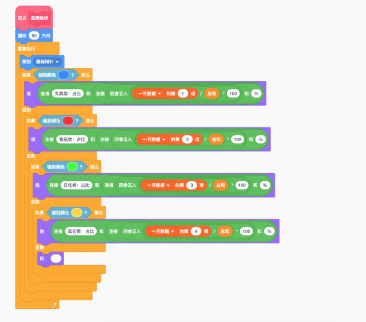 至于问题中提到的鼠标移动到区域要显示品类和比例,用颜色触碰侦测,根据颜色明确数据项,再计算比例即可。