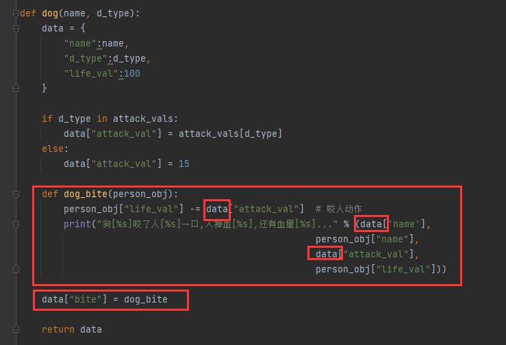这样的话在外面是没办法调用dog_bite这个函数的;如果想在执行函数的时候不调用dog_bite,在后面可以调用dog_bite函数,你可以把dog_bite存在data里面(为了可以在函数外部可以调用dog_bite方法),这样在dog_bite函数里就可以不要传dog_obj的值(将dog_bite的dog_obj改成data),现在dog_bite的动作就只属于dog了