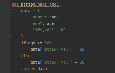 if 判读age(年龄)>=18,也就是成年人攻击力为50,当age不>=18就为未成年,攻击力为30