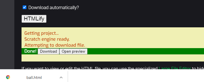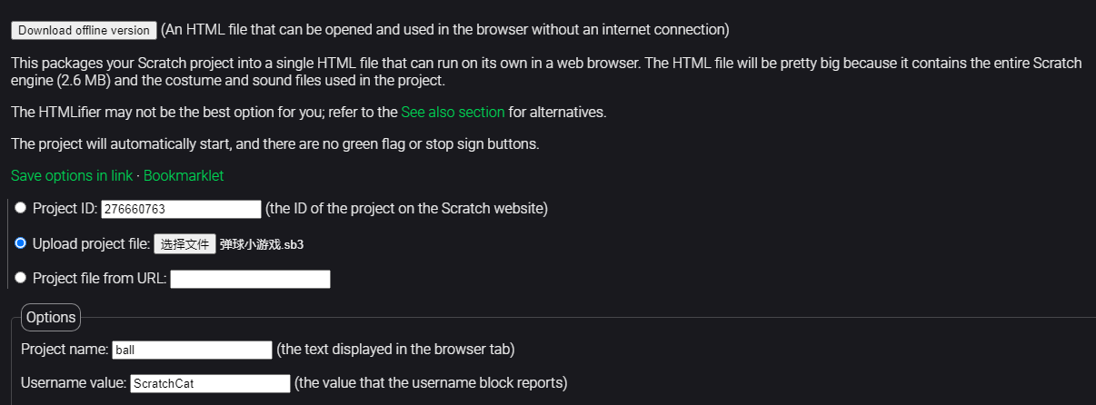 1、https://sheeptester.github.io/words-go-here/scratch3-htmlifier/网站Upload project上传本地sb3文件,或者先把本地sb3文件上传到mit scratch社区上,得到一个项目号Project ID。选择HTMLify without minification(recommended)如下图所示,完成后会下载得到文件ball.html。