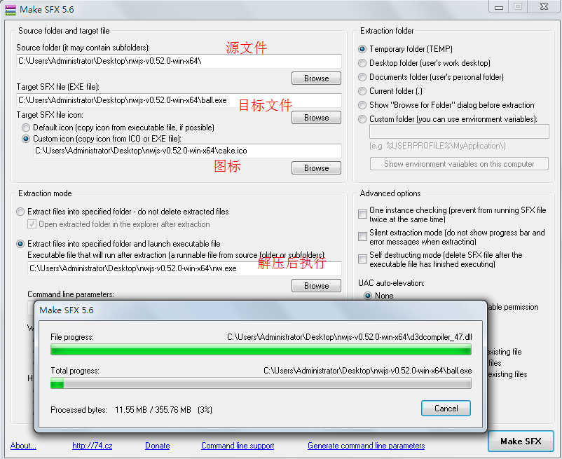 3、http://revocue.cz/en/make-sfx/index.php 下载makesfx.exe,可以把nw.exe所在目录所有的文件制作成一个exe文件,可以定制文件名和图标。