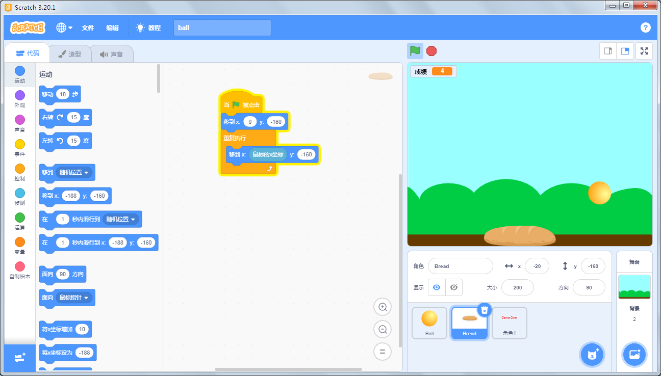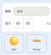 首先把小猫角色删除掉。从角色列表中添加Ball与Bread,将Ball放置在0,0位置,将Bread的大小设置成150放置在0,-160位置