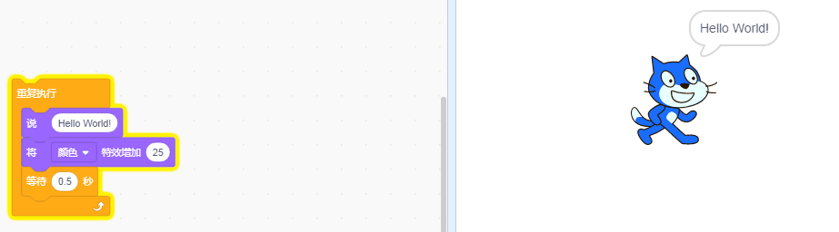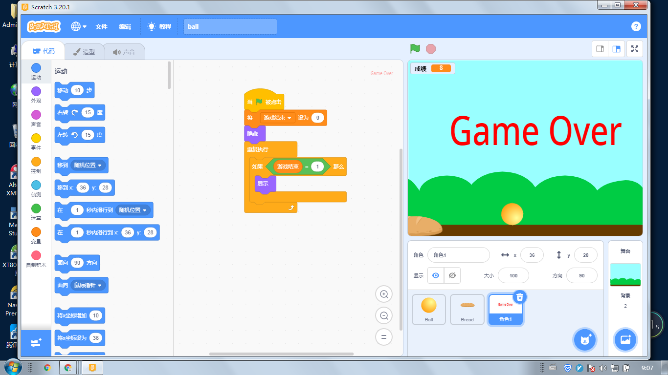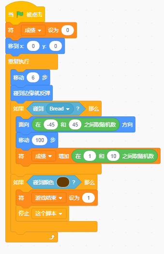 然后按照方向移动,要加上“碰到边缘就反弹”,不然跑走回不来了。