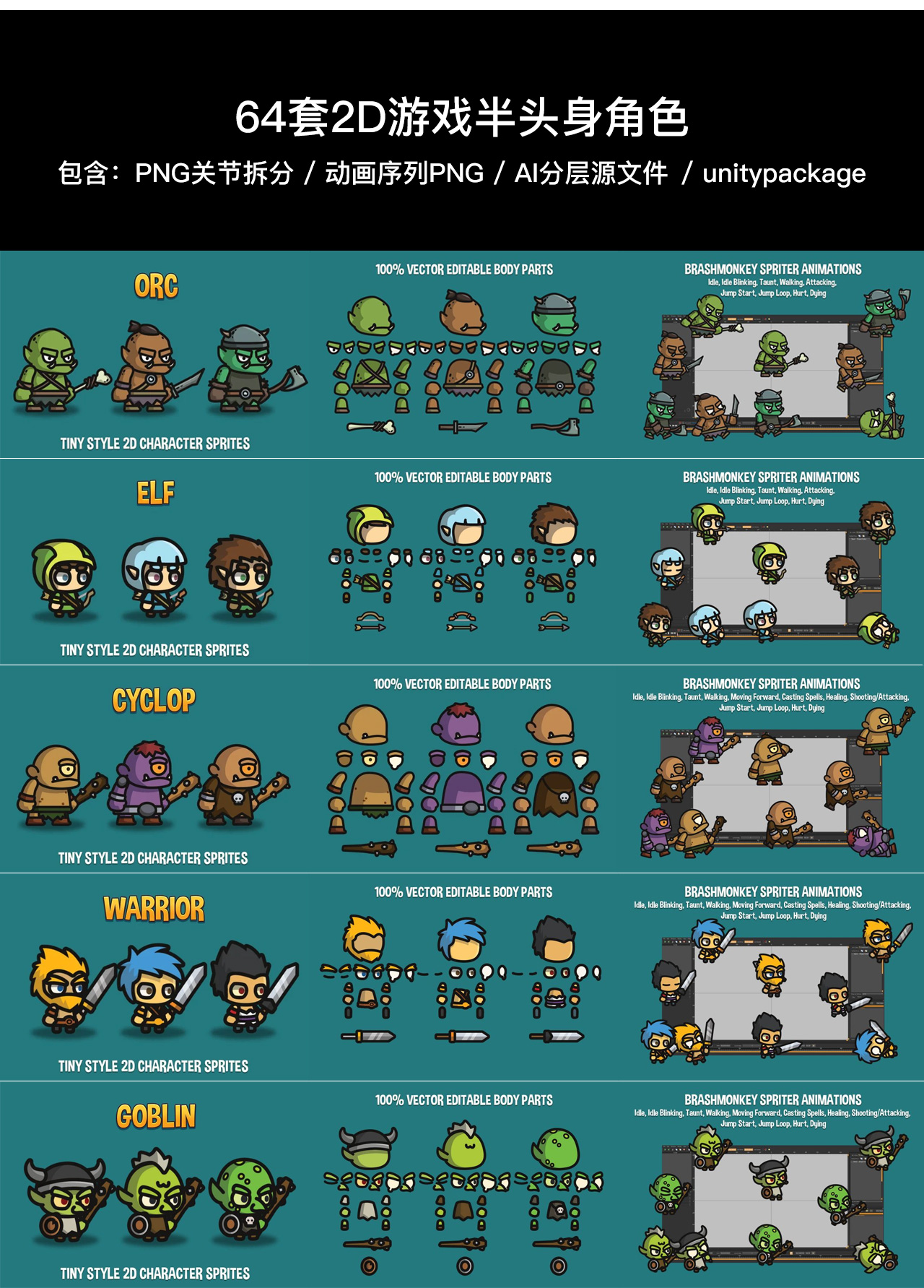 骨骼角色素材包:该系列角色均为半头身卡通风格,搭配上面的地图可以说绝配。角色均包含动画:进攻;嘲讽;步行;闲;空闲闪烁;垂死伤害;跳跃循环等(动画序列)。角色素材包含以下格式:AI,EPS,PNG,SCML(Spriter Brashmonkey骨架动画)和Unitypackage文件。