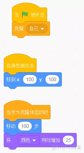 【高级应用提示】Scratch中的克隆可以使用积木命令【当作为克隆体启动时】递归地克隆自身,有兴趣的朋友可作这方面更深入的探讨。