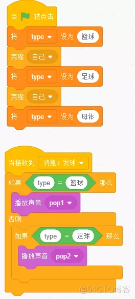 私有变量“type”的值由每个克隆体从母体精灵继承,而母体精灵却会忽略接收广播的消息,因为它自己的“type”值不同。这种技术允许许多不同的克隆体类型以各自独特的方式工作。
