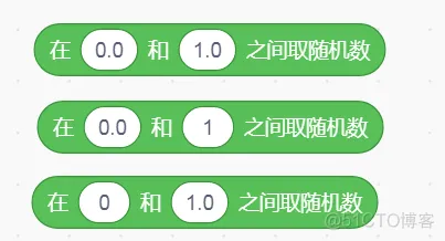 初学者可能认为上面积木只会在1到10这10个数中随机生成一个正整数。不错,如果你这样使用的话。但是,有些时候可能你想生成一些随机的实数,例如在0和1之间生成某一个随机纯小数,此时你可以使用如下几种形式: