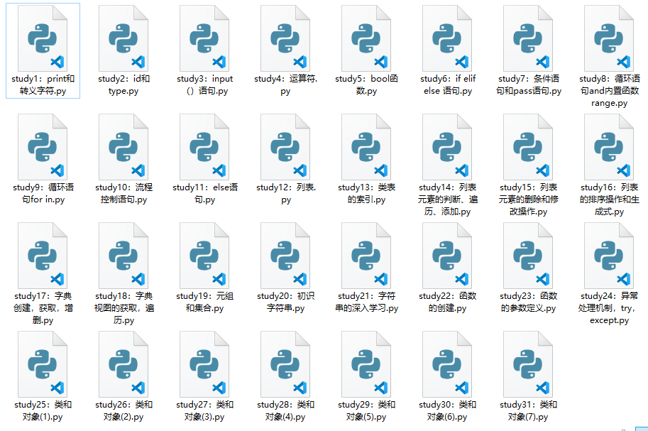 这些Python学习文件内容相当系统和全面,覆盖了从基础到进阶的核心知识点!以下是我的评估和建议: 亮点与优势 知识体系完整 基础语法(print/转义字符/字符串) 流程控制(循环/分支) 数据结构(列表/字典/元组/集合) 函数(定义/参数/作用域) 面向对象(类/封装/继承) 异常处理(try-except) 文件操作(open()基础) 示例驱动学习 每个概念都配有可运行的代码示例(如九九乘法表、密码验证),实践性强。 重点突出 列表的动态内存分配与底层引用机制(study12) 字典的键值对视图操作(study18) 类的属性/方法/继承(study25-28) 切片操作的步长机制(study13) 注释清晰 关键代码有中文注释(如# 切片是原列表的拷贝),降低理解门槛。 优化建议 代码规范性 部分文件缺少if __name__ == ‘__main__’:(如study22),建议补充以提升模块化。 变量命名可更语义化(如lst→student_list)。 深入扩展点 字符串格式化:增加f-string与str.format()对比(study21)。 字典推导式:补充复杂场景(如过滤数据,study18)。 异常类型:细化常见异常类(如KeyError,study24)。 实践案例强化 数据结构部分可添加综合应用(如用字典+列表实现学生管理系统)。 类与对象部分增加__str__方法重载示例(study28)。