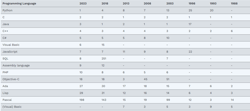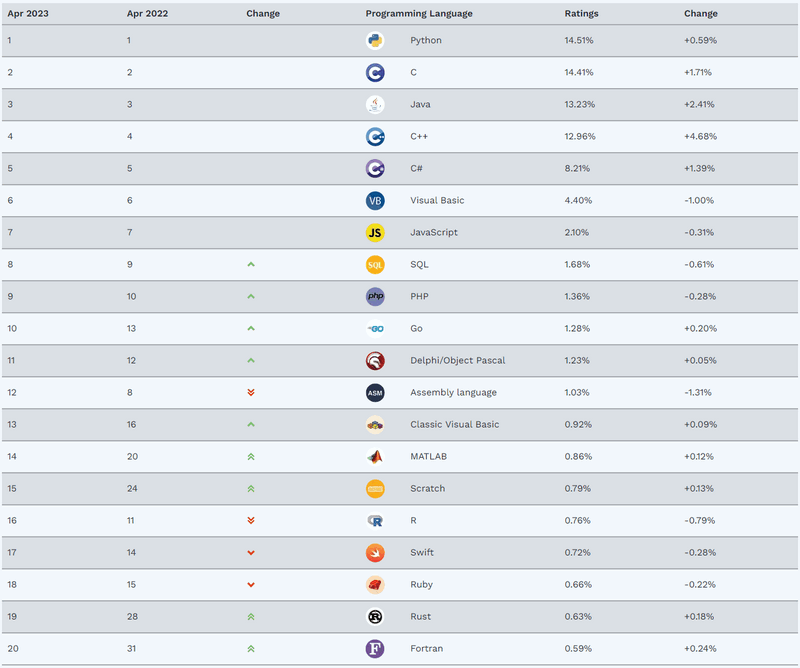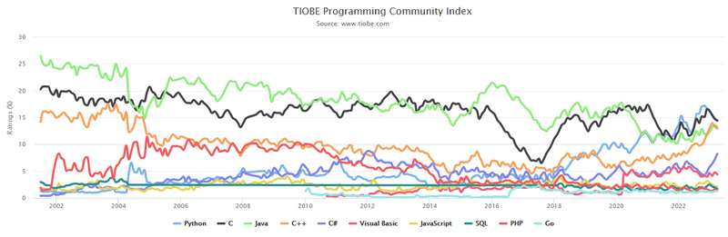 TIOBE 排行榜是根据互联网上有经验的程序员、课程和第三方厂商的数量,并使用搜索引擎(如:Google、Bing、Yahoo!)以及 Wikipedia、Amazon、YouTube 和 Baidu(百度)统计出排名数据,只是反映某个编程语言的热门程度,并不能说明一门编程语言好不好,或者一门语言所编写的代码数量多少。
