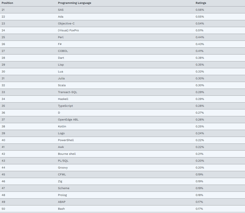 TIOBE开发语言排行榜每月更新一次,依据的指数是基于世界范围内的资深软件工程师和第三方供应商提供,其结果作为当前业内程序开发语言的流行使用程度的有效指标。