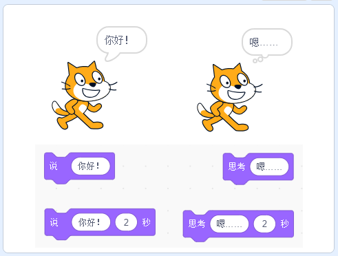 1.使用说…和思考…积木命令角色说话或者思考,就像漫画一样,如下图所示(左面小猫为说话,右面小猫为思考,区别在于思考时会冒出几个小泡泡)并且说…和思考…中的内容会永久地显示在气泡中。