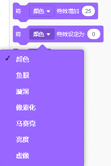 这组积木块为角色或背景的各种特效,通过下拉三角,可以发现有很多种特效。
