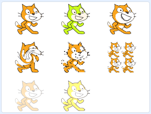 连续使用多个特效积木可以给一个图形添加各种特效。下图展示了所有的特效。