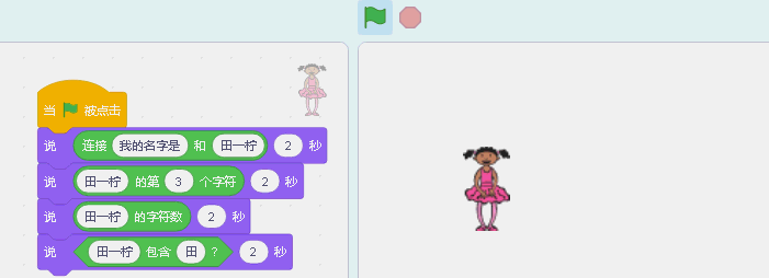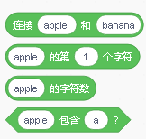 这组积木块主要用来连接字符串,比如一串字符里需要用到某些变量值的时候;或者选择字符串中某一个位置的字;以及检测字符串的长度;还有判断字符串里是否包含某字符。案例如下图: