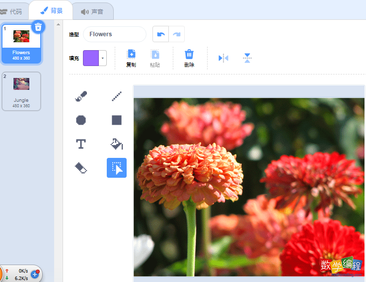 1、从背景库中选择“flowers”图片作为背景,再从背景库中添加“Jungle”图片,命名为flower bed。舞台显示“flowers”背景。