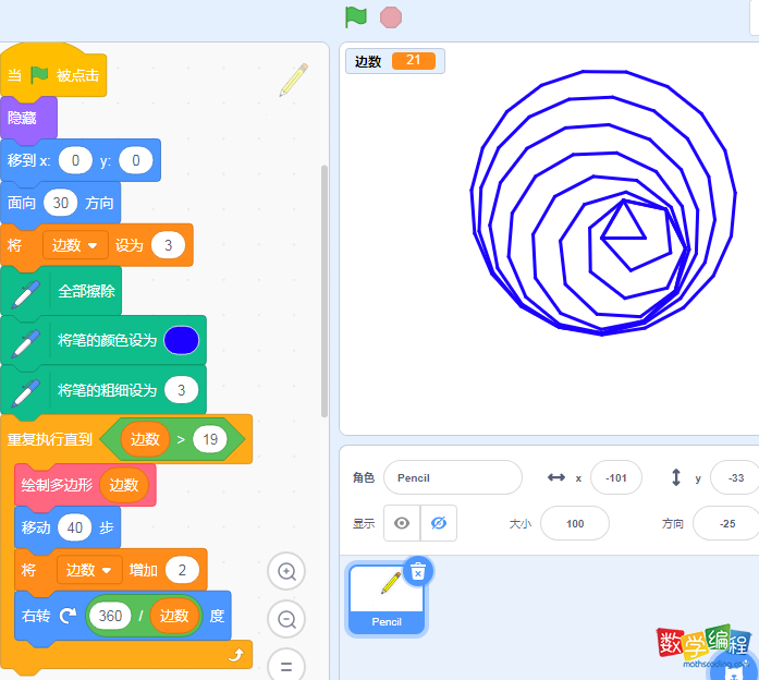 scratch绘制多边形,是第十届蓝桥杯选拔赛中一道scratch编程问题。这是一个图形题目,主要考察考生的分 析能力、角度知识和scratch的画笔应用。绘制以3、5、7、9递增2的多边形,直到递增到19为止;