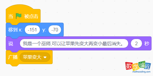 步骤二、点击绿旗后,角色背景如图,巫师说“我是一个巫师,可以让苹果先变大再变小最后消失。2秒”
