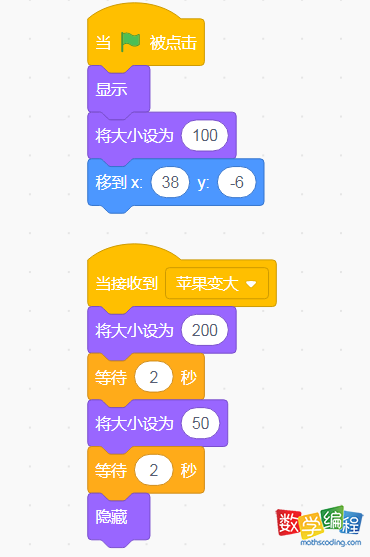 步骤三、广播“苹果变大”,当Apple角色收到苹果变大的消息,将苹果大小变为200,并等待2秒,接着苹果大小变成50,并保持2秒。