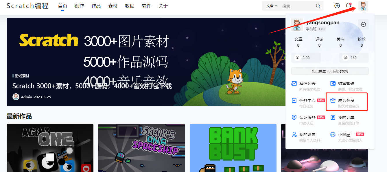 1、成功登录Scratch5.com平台之后,点击右上会员图像,然后再点击成为会员