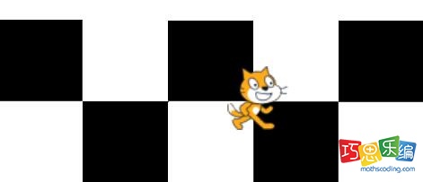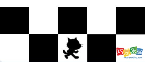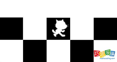 步骤一、打开scratch软件,保留小猫的角色。背景点击绘制,黑白相间的正方形方块,如图;初始化小猫的大小,以及清除图形特效;