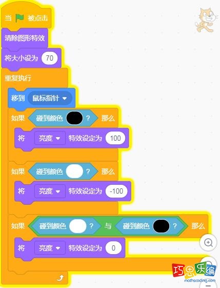 步骤三、判断是否碰到白色,如碰到白色,将小猫的亮度特效设定为-100;如碰到了黑色,将小猫的亮度特效设定为100,如既碰到了白色也碰到了黑色,将小猫的亮度特效设定为0;