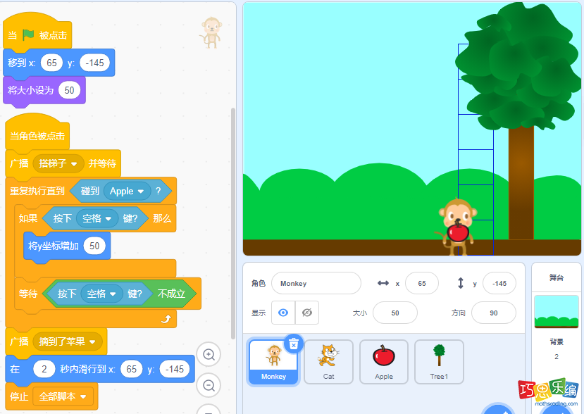 scratch猴子搭梯子,是蓝桥杯2020年9月的STEMA考试中的一道scratch编程真题。此题难度系数还可以,只需逻辑理清楚了就好下手,主要是考察学生对事件模块以及画笔的总和运用;猴子想吃苹果,但是苹果树太高了, 它只好自己搭建梯子,爬上梯子将苹果摘下来,吃到苹果。