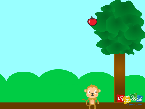 4)当猴子爬到上面碰到苹果时,苹果和猴子同时用2秒钟时间慢慢回到地面上,程序结束;