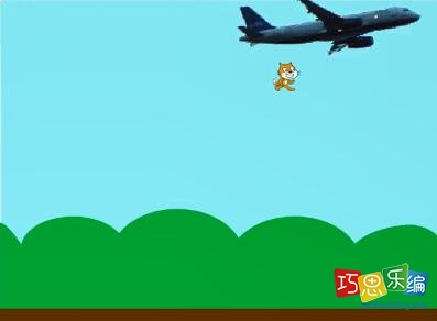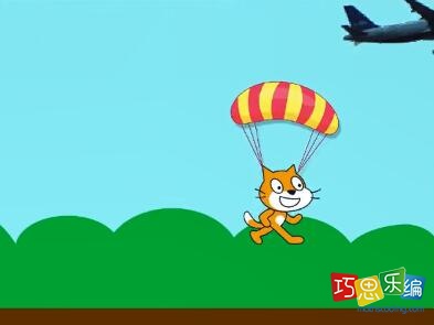 2 )在飞机飞行的过程中,如果按下空格键,大小为10的小猫就从“飞机所在位置跳伞;