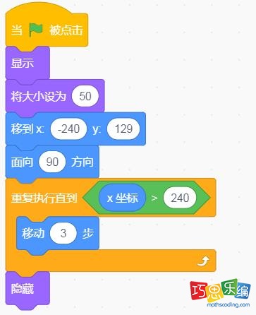 步骤二、点击绿旗后,飞机从最左侧位置坐标(-240,129)出来,面向右,每次移动3步,直到x坐标>240停止循环,隐藏飞机;