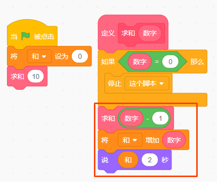 通过上一篇scratch递归算法教程,阶乘递归算法分析的学习,我们就不难对以上案例的理解了,当递归在遇到边界条件数字=0时,需要做一个回归的计算操作,也就是要把调用自身方法之后的内容继续递归执行一遍。而此时的数字值已经是1,于是就是从1开始加。