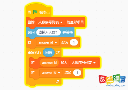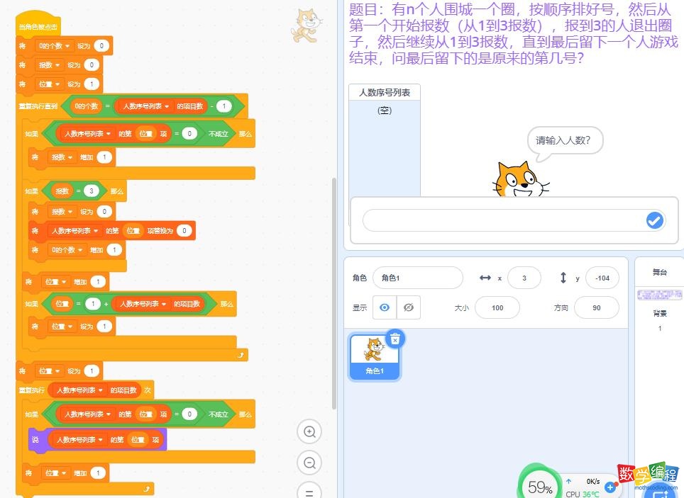 用scratch来解答一道蓝桥杯真题,C++解答版本可以点击查看《C++解蓝桥杯真题:有n个人围城一个圈,按顺序排好号,然后从第一个开始报数,报到3退出圈子,继续从1到3报数,直到剩下最后一个人,求最后留下的是几号》