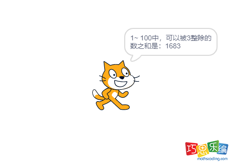 步骤三、用连接符连接“1~ 100中,可以被3整除的数之和是:”和sum,并让小猫说出来;