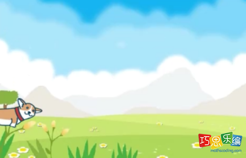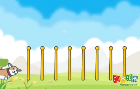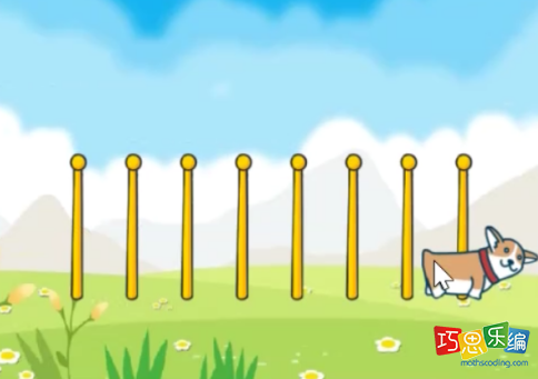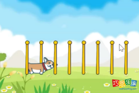 要求:从第1根柱子后面绕过,从第2根柱子前面绕过,从第3根柱子后面绕..以此类推。(可明显看到小狗跑动的过程,且动作连贯没有延迟与卡顿,请以程序演示视频为准);