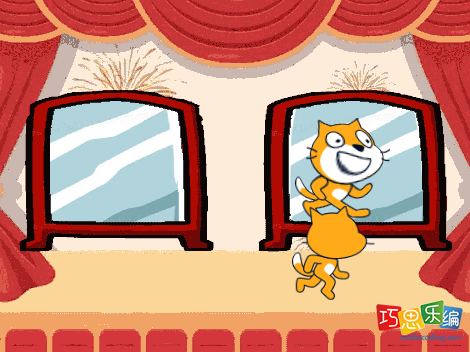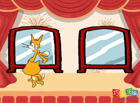 3)当小猫走到右侧哈哈镜前时,哈哈镜了中开始出现胖群的特效小猫,并且镜子中的影像要跟随小猫起移动;