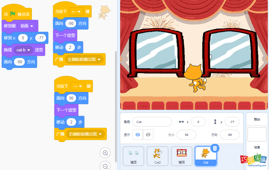 步骤二、当按下健盘上的右方向健,小猫面向90度,向右移动2步。当按下健盘上的左方向健,小猫面向-90度,向左移动2步;发送广播消息给哈哈镜中的小猫Cat2;当松开按键,小猫停止移动;