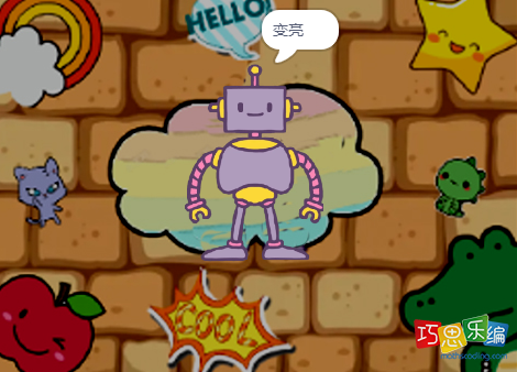 步骤一、选择角色机器人,和背景墙。点击绿旗,初始化机器人的坐标位置(0,15),背景亮度特效设为-30;