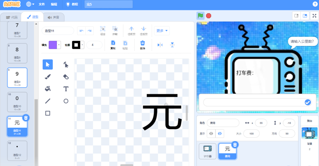 步骤一、根据题意需要两个角色,一个是计价器,一个是显示的价格费用。两者都有不同的造型,计价器的造型如图,费用角色的造型如图;初始化角色的造型以及坐标的位置;