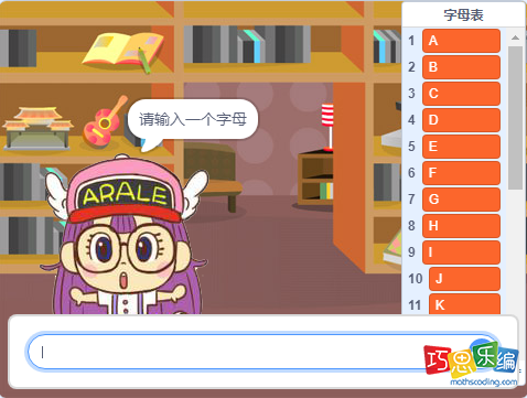 2)等待1秒,阿拉蕾说: “请输入一个字母”,舞台下方出现询问框;