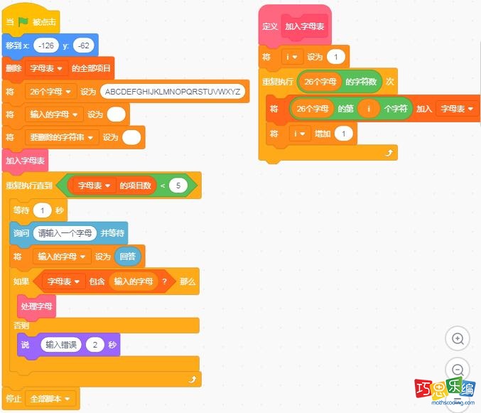 步骤一、上传角色阿拉蕾,初始化角色,另外新建变量“26个字母”,初始化赋值ABCDEFGHIJKLMNOPQRSTUVWXYZ;变量“输入的字母”初始化为空,变量“要删除的字符串”初始化为空。新建列表“字母表”点击绿旗,新建积木函数“加入字母表”,将26个字母加入列表;