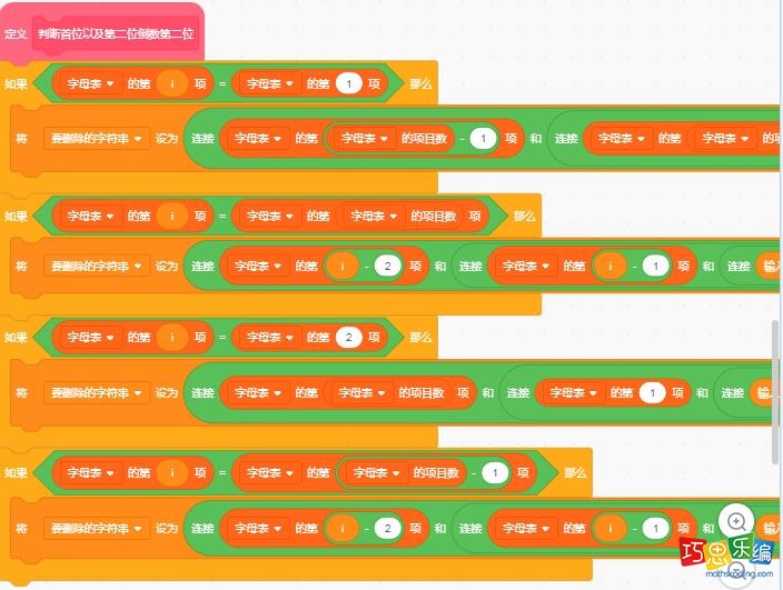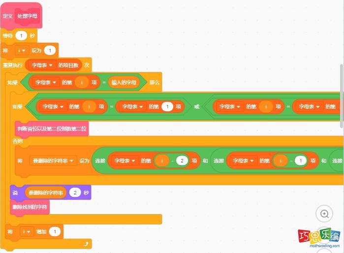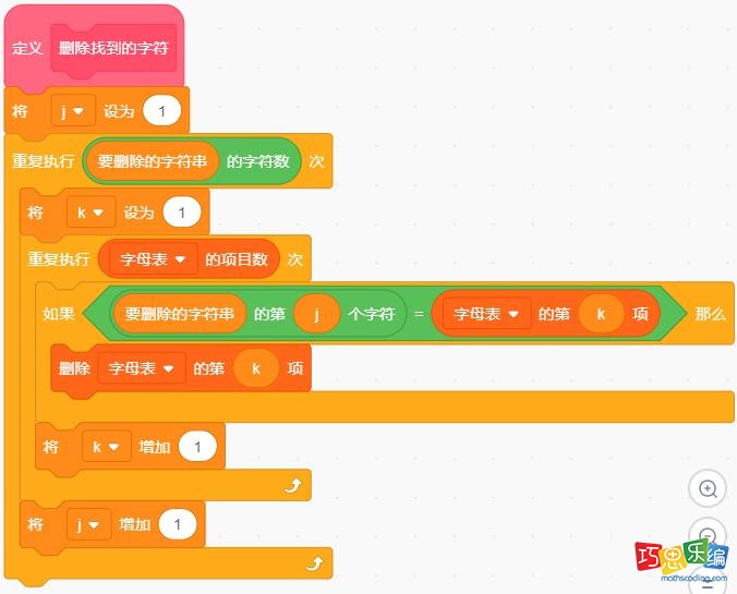 在找的过程中,重复循环“字母表的项目数”次,找到后,将其一个一个的赋值给“要删除的字符串”变量;然后说出要删除的字母,再去删除;删除字母有“删除找到的字符”积木完成;双重循环去判断,一个一个字符去遍历,从列表中找到后,一个一个的删除;