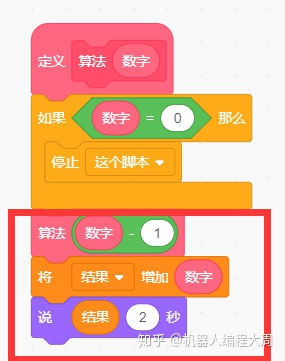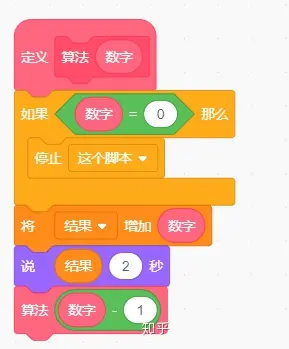scratch编程,使用画笔或数学运算经常会使用递归算法。最简单的举例,计算从1加到10的结果,就可以用递归来解决。如下示例,每次调用都会数字相加,并将数字减1直至数字为0,其最后输出结果保存在结果变量中。