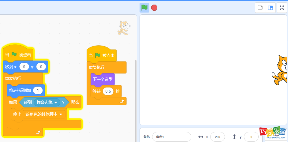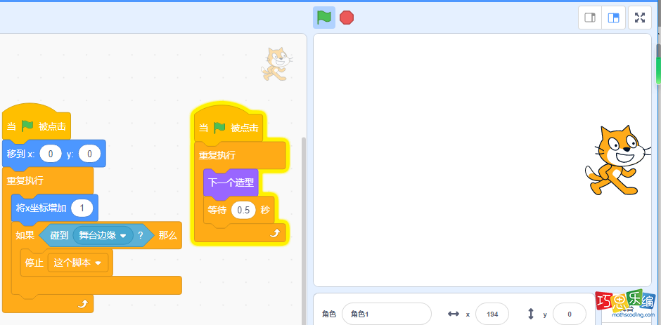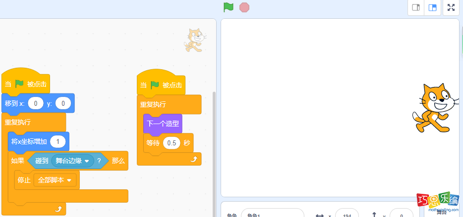 绿旗点击后,小猫向右移动,同时每个0.5秒切换一次造型,重复执行此动作;当小猫碰到舞台边缘时,停止这个脚本,也就是停止小猫移动的这个脚本,小猫切换造型的脚本是不会停止的,所以,当小猫碰到了舞台时,小猫停止移动,不离开舞台,但是会继续切换造型;