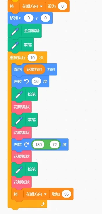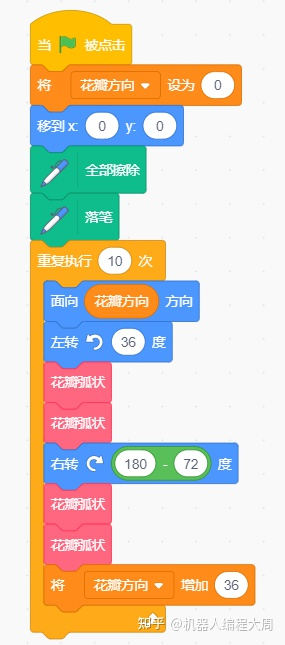 这道题的第二个难点,就是计算旋转的角度,这需要数学功底。我们不妨假设每个花瓣顶角是36度(当然这个假设是有一定依据的360度/10),那么花瓣的角度就应该是36*2=72度。我们重新整理下逻辑,代码如下: