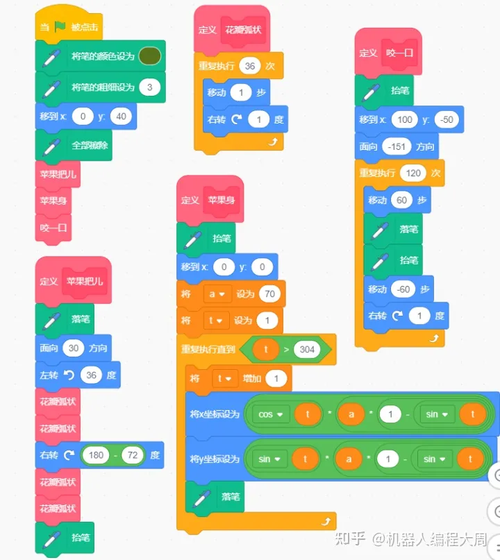 以苹果为例。最上面那不就是个花瓣,只不过有个角度而已;下面的苹果可以看做个心形,也可以看做几段圆弧,被咬的一口是个圆弧。