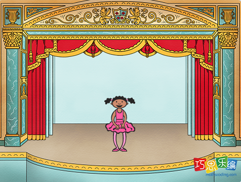 (1) 点击绿旗,角色Ballerina,初始造型为ballerina-a, 初始背景为Theater,初始位置在舞台左侧;
