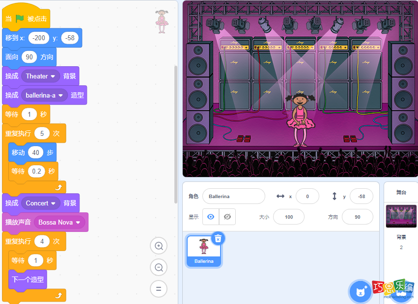 步骤三、换成Concert背景,播放声音Bossa Nova;等待1s,切换造型,重复循环4次,最后切换为ballerina-a。