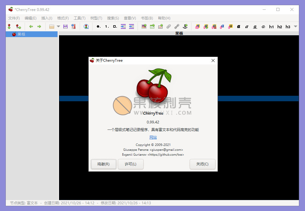 CherryTree是一个支持无限层级分类的笔记软件,Python编写,支持富文本编辑和代码高亮,支持Mac、Linux、Windows平台。