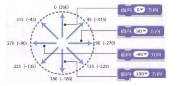 下图给出Scratch 3.X中精灵的方向规定。