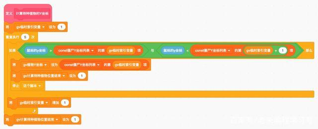 上面代码中我在当前调试的植物大战僵尸游戏中使用的,代码意思很明确:通过上述两个自定义积木计算当前要种植的植物的坐标位置。